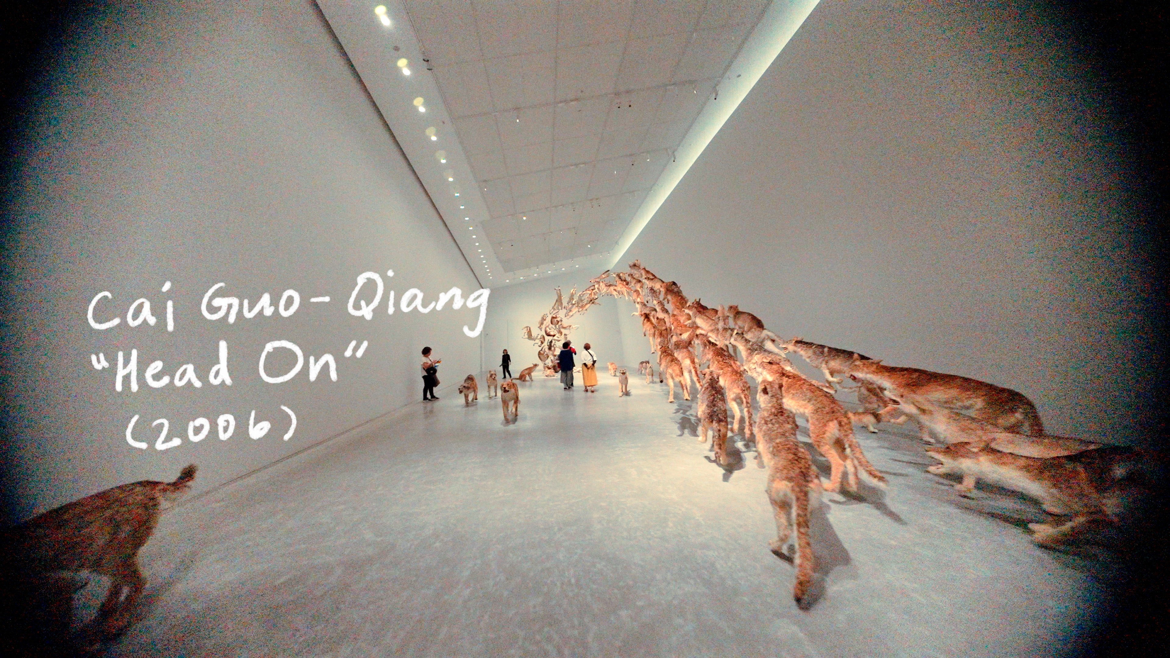 Cai Guo-Qiang’s “Head On”—a dramatic installation of 99 life-sized wolves hurling themselves toward a glass wall—held the room in a suspended rhythm. The motion is frozen, but the force still reverberates. There’s something mythic and unsettling in the repetition, like watching a parable unfold on loop.
