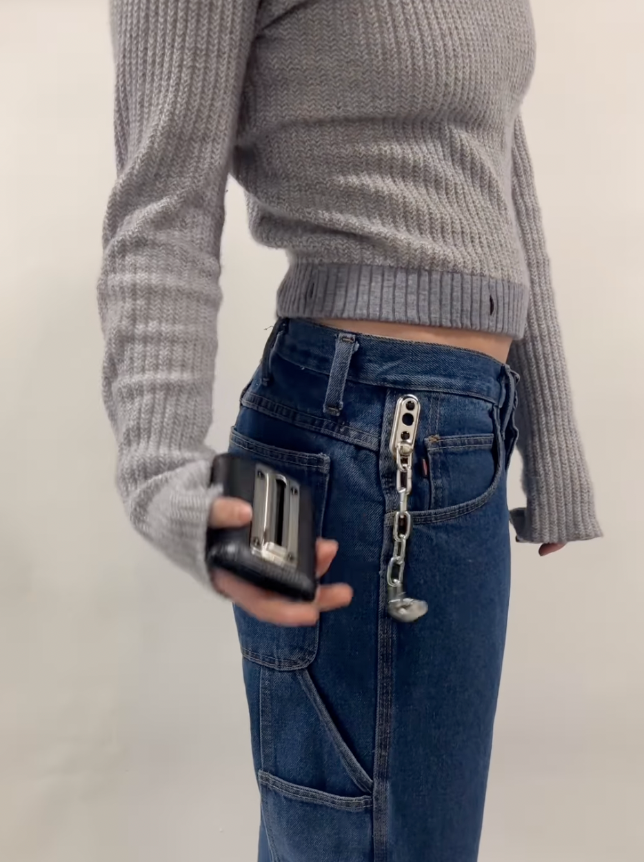 - The Door-Chain Wallet: This iconic piece features a standard metal house door chain. By mounting the guard on her wallet and the slide on her jeans, she created a "security-chic" fashion set that is both clever and visually striking.