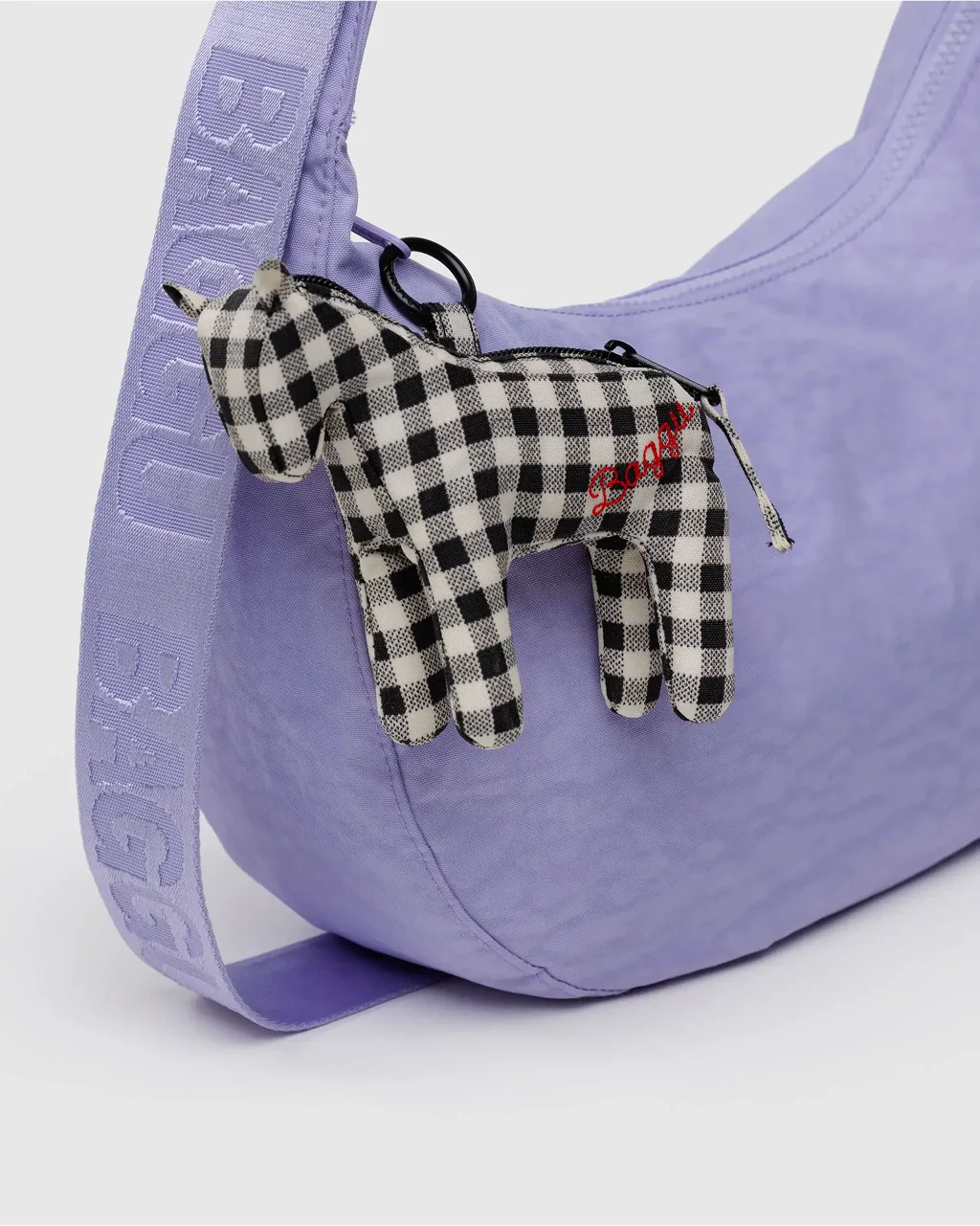 Bag charms are the breakout accessory of the year. This recycled heavyweight nylon horse adds a touch of whimsy to a high-end handbag, proving that style doesn't always have to be serious. The pattern is adorable and perfectly accents that black shoulder bag she wears every day.