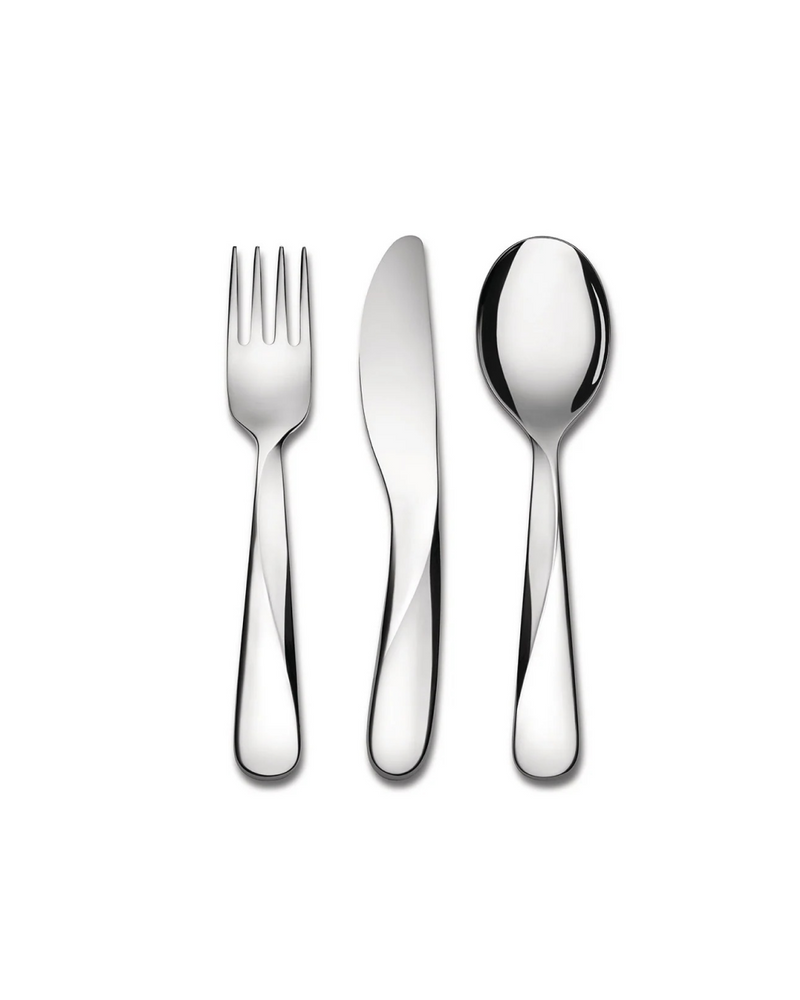 Giro Kids is a set of cutlery consisting of knife, fork and spoon. Careful adaptation to the needs of very young children has made these the perfect tools for eating their first meals on their own. The fork has rounded tips and wide prongs, with a slightly cupped shape, similar to that of a spoon. The knife has a rounded tip and a blunt blade.