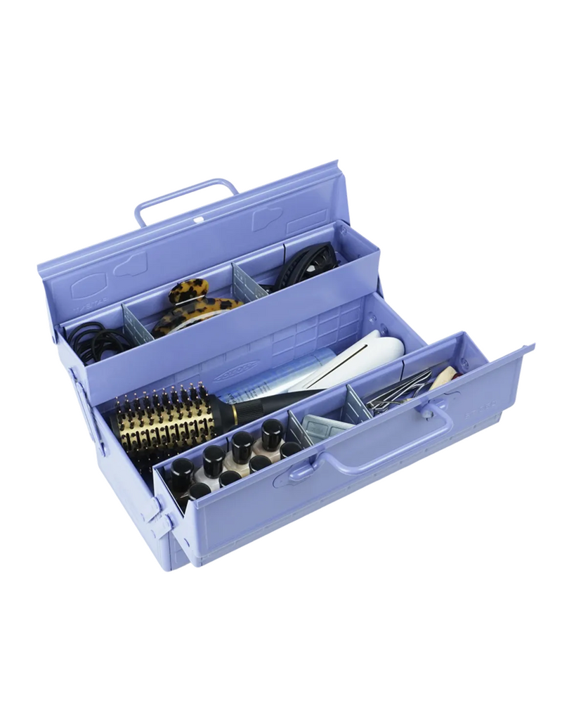 Steel toolbox with cantilever lid, one upper storage tray with adjustable and removable dividers and hole for a padlock. Use for art supplies, make-up, medical supplies, snacks or tea - the possibilities are endless.