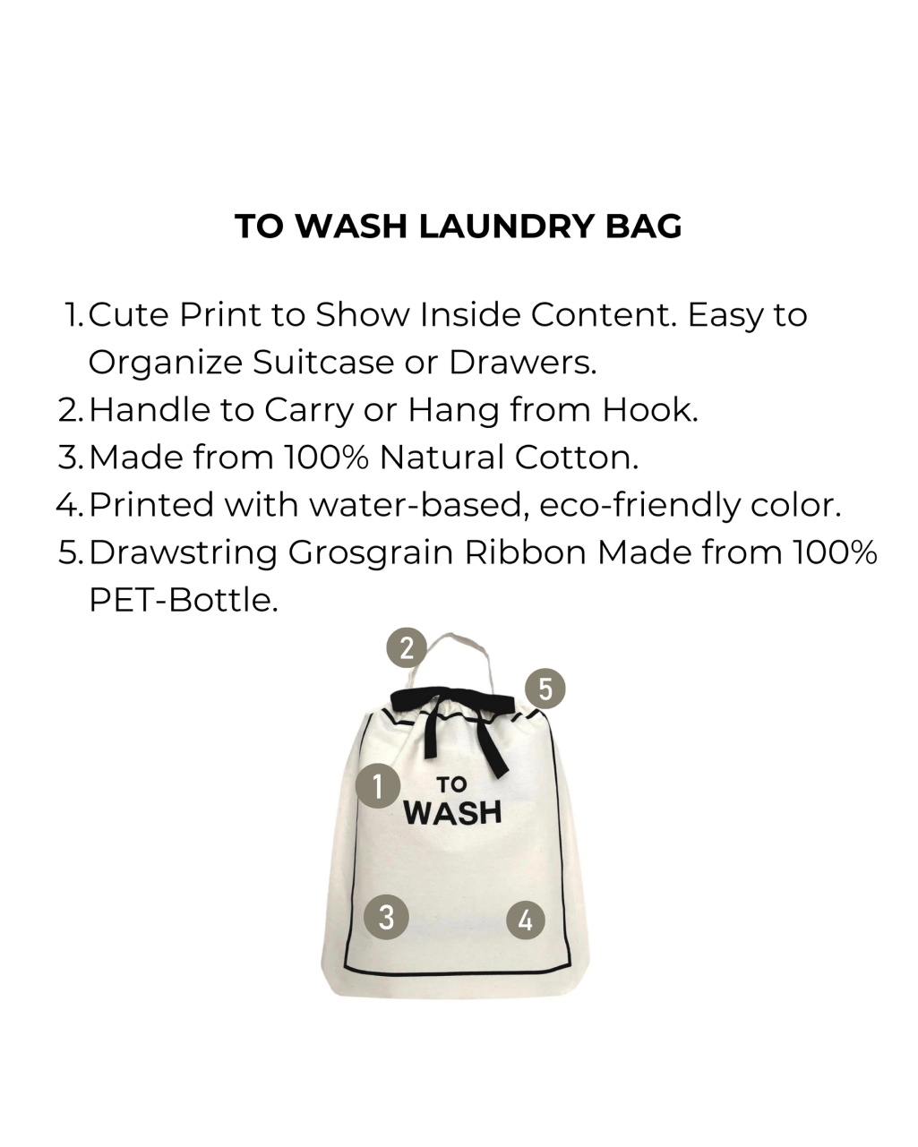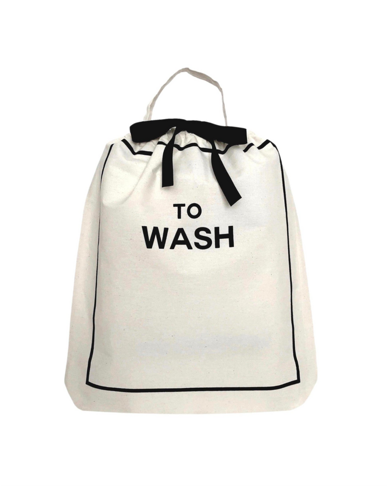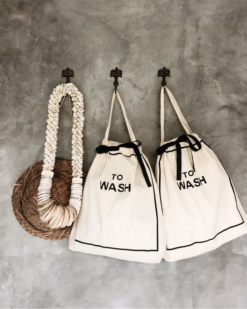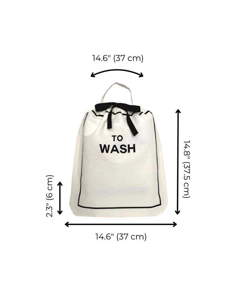 The To Wash Bag in cream is a stylish and practical way to separate dirty clothes from clean ones, whether at home or while traveling. Made from 100% natural cotton, it features a sturdy handle for easy carrying and a grosgrain drawstring made from recycled materials. Its sleek, unisex design makes it a perfect travel essential or gift. Pair it with the To Wear Bag for an organized packing experience.