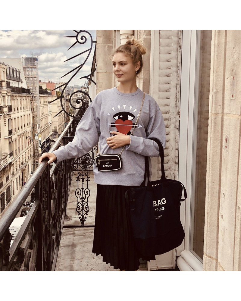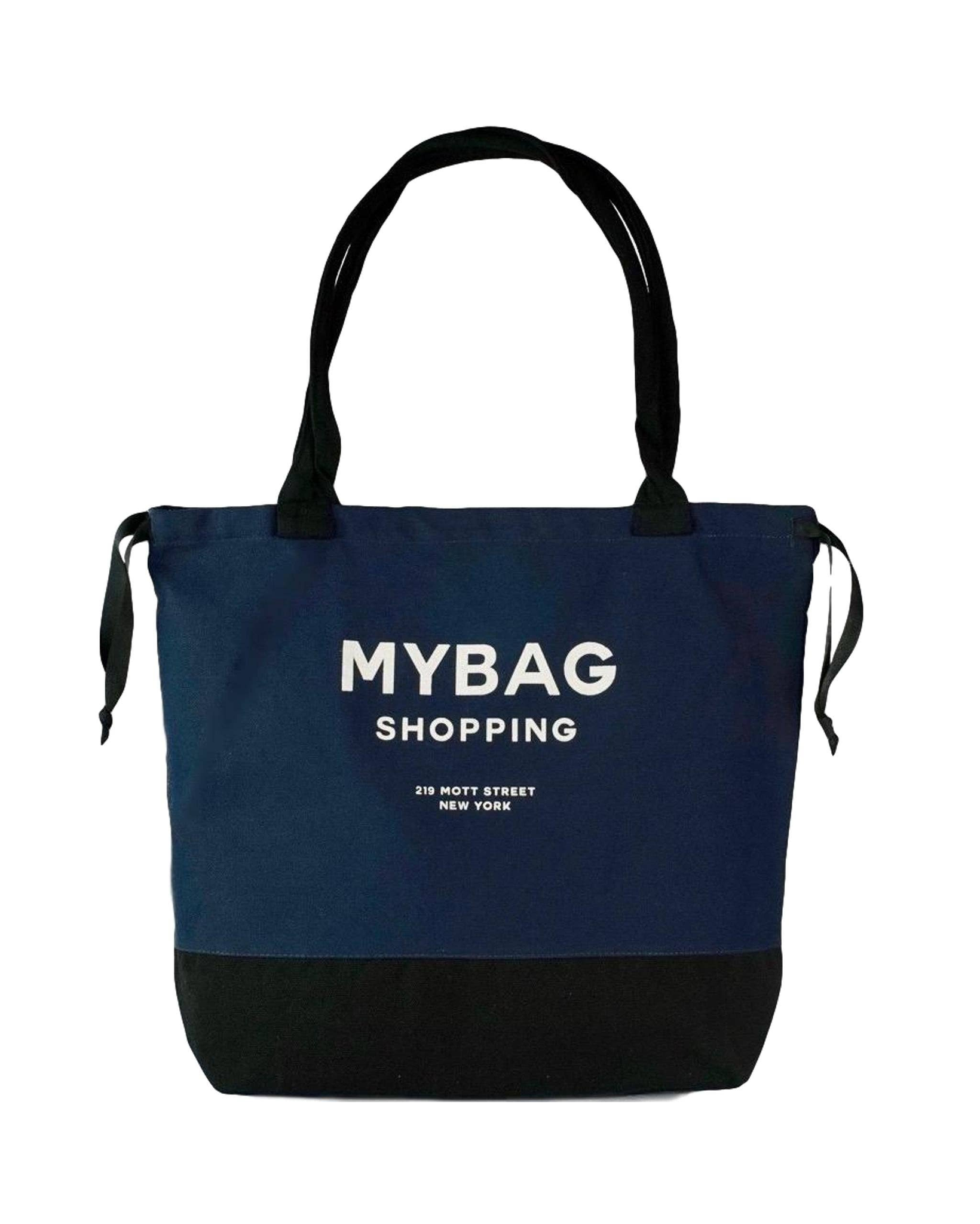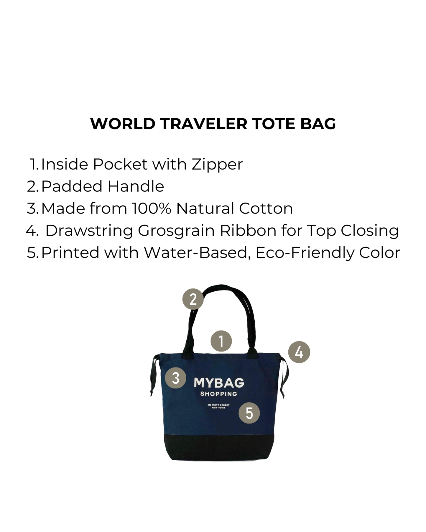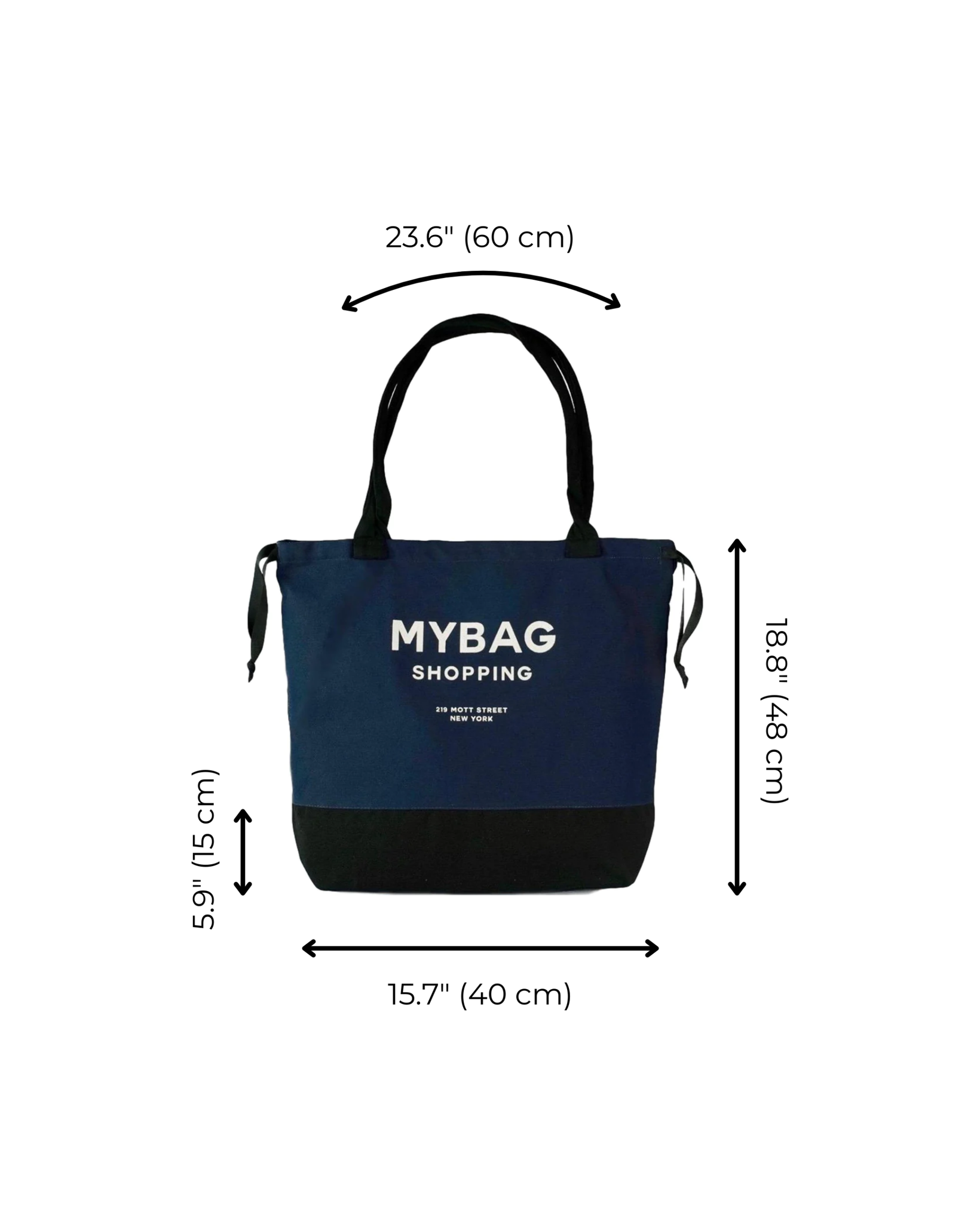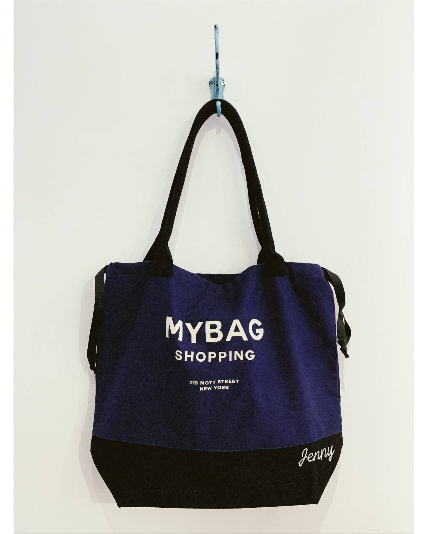 Don't miss out! This item is discontinued and there are only a few left, so this is your last chance to get it! Our World Traveler Tote is back in a new style! This tote comes with a drawstring closing, and a zipper pocket inside for your phone, keys, sunglasses, and such. It has padded handles for enhanced comfort and fits everything you need on a day or night out. Bag-all's signature MY BAG print is in stylish cream color on this navy tote. Add a unique monogram such as your nickname, initials, or any word of your choice to make it yours. The monogram looks awesome on the black part, in the bottom right corner.