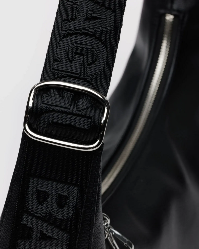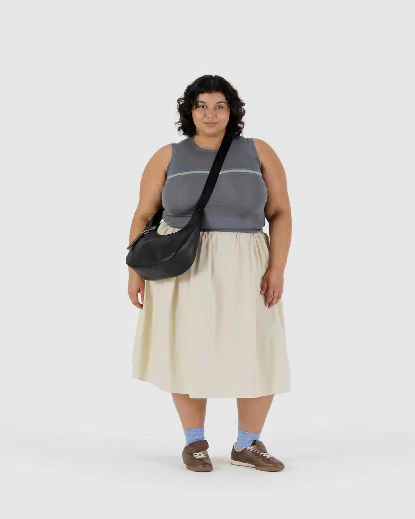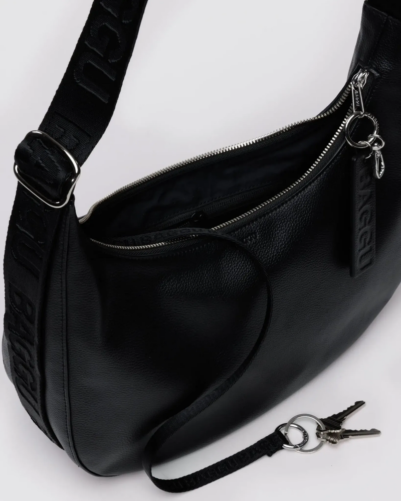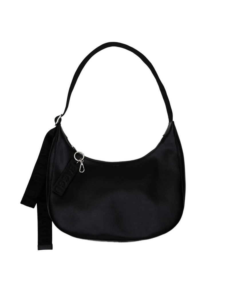 Our medium crescent shape in recycled leather. Elevated, durable, and roomy. With an interior zip pocket and thoughtful additions like a key leash and debossed keychain.