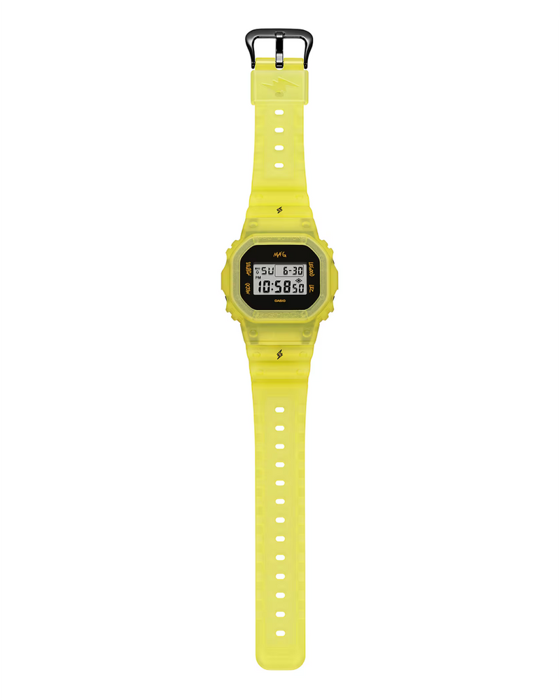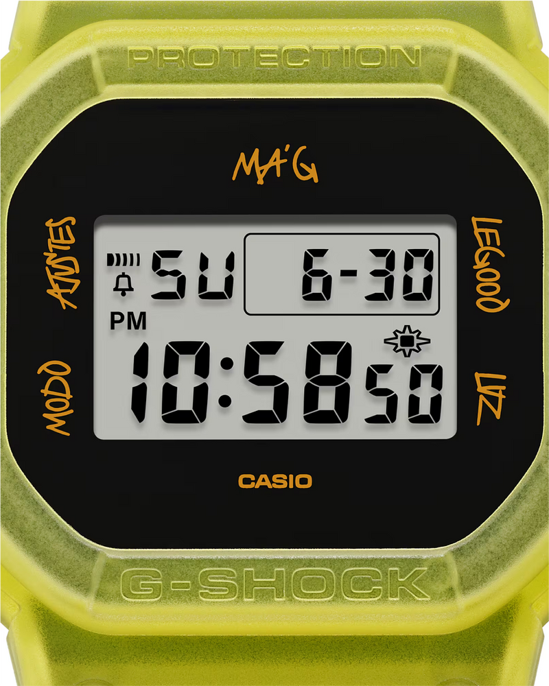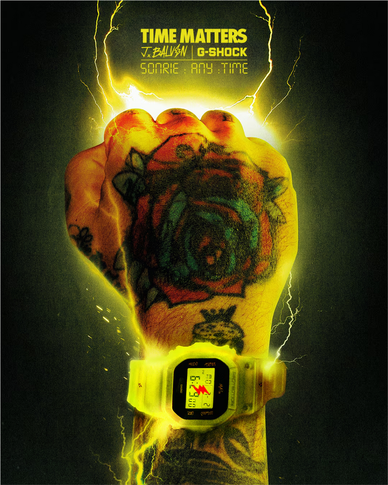 The G-SHOCK x J Balvin "Ma G" is a first-of-its-kind collaboration, celebrating Latin culture and artistry. Featuring J Balvin’s handwritten Spanish mode indicators and the "MA'G" text, this watch brings a personal touch. The DWE-5600 model comes with interchangeable bezels and bands in matte yellow and classic black, along with signature lightning bolt branding. Built for durability, it includes shock resistance, 200M water resistance, and a carbon core guard structure.