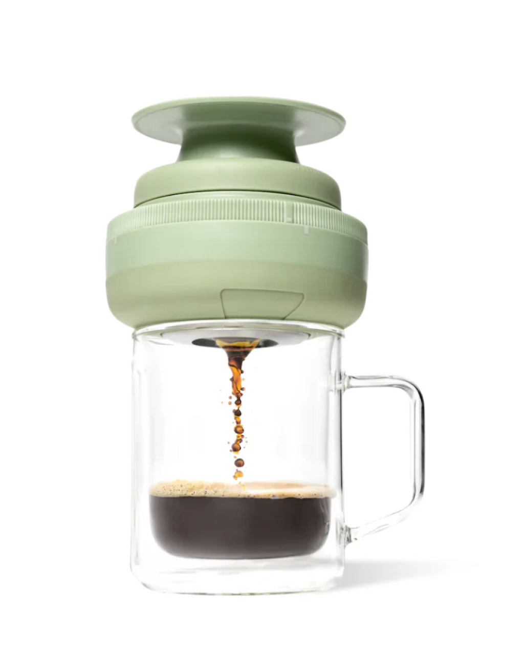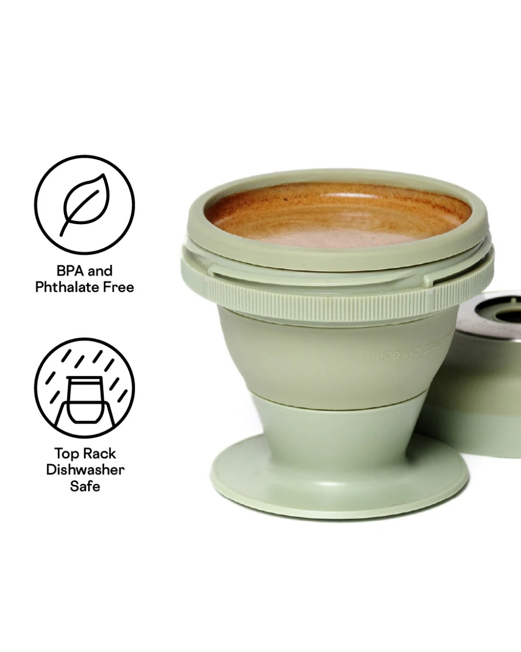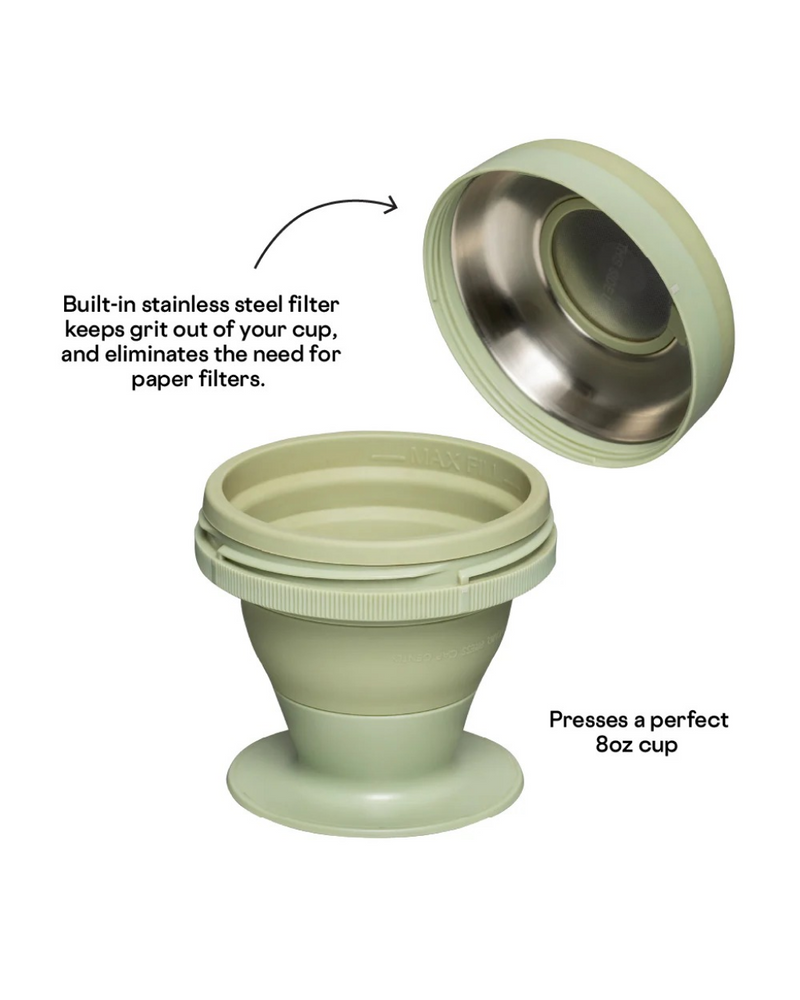 Pour over meets French Press with the Corkcicle Palmpress. This portable, lightweight brewing container creates a perfectly balanced, high quality 8oz brew in 3 minutes. Similar to the AeroPress inverted method, the Palmpress allows the coffee grounds to be immersed in water longer than a pour over, so you can customize your perfect pour. Perfect for making Espresso, Americano, Cold Brew and more! Better-For-You Materials: Coffee never contacts plastic. BPA-free and phthalate-free. The materials that contact coffee are stainless steel and LFGB grade silicone. The outer shell is a durable ABS plastic which never contacts coffee.