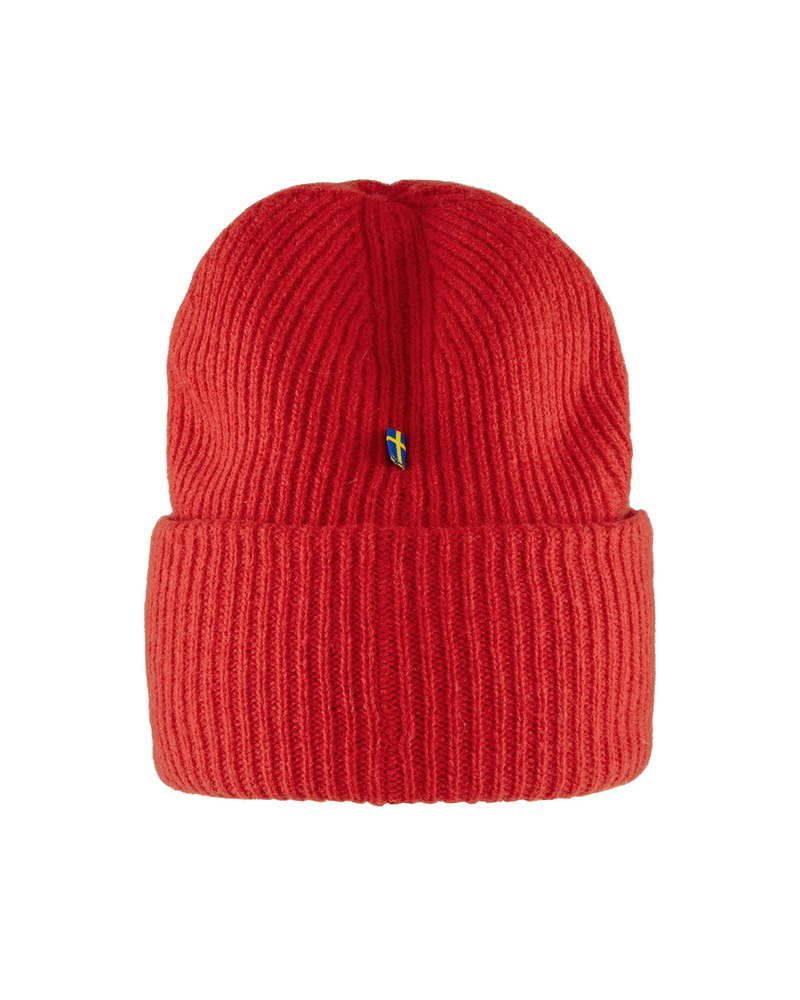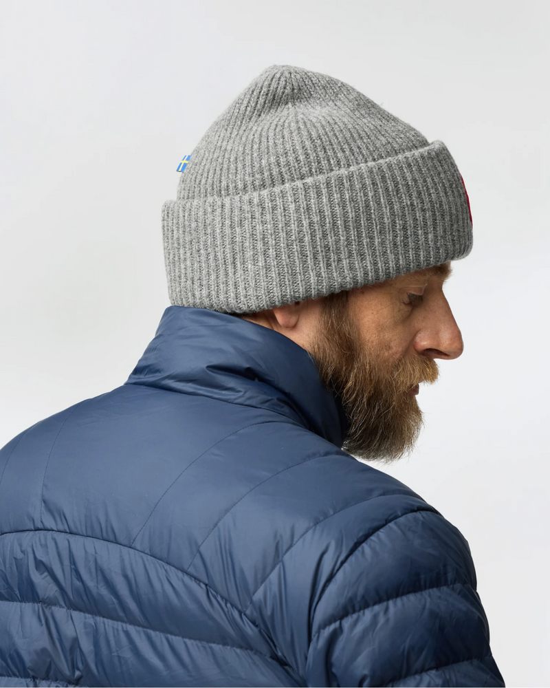 Rib-knitted hat in soft, warm lambswool. Robust, two-layer knitting with wide folded edge. Embroidered Fjällräven emblem on the front.