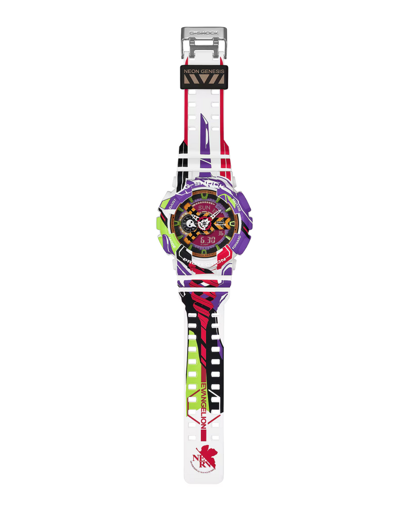 The GA110, also used in the first EVANGELION collaboration in 2010, serves as the base model. EVA Unit-01, the central figure of the series, appears throughout the design: its horned headgear on the short band, its face on the bezel, and its right arm gripping the Spear of Longinus — just before the throw — extending from the lower bezel to the long band.