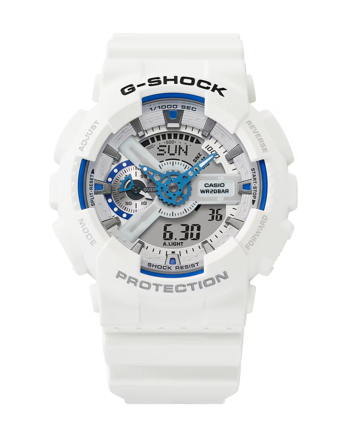 Take your inspiration from the summer seas, with the white and blue G-SHOCK. The watch’s blue phosphorescent face glows magically at night, evoking the shimmer of bioluminescent plankton floating in the sea. Paired with a white and blue color scheme, the design beautifully captures the beach’s dynamic transformation from the brilliance of the daylight sun to soft nighttime hues. Shimmery sea-inspired styles flow easily from casual settings to work situations.