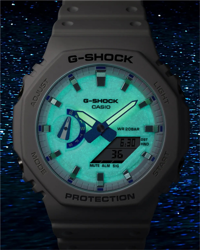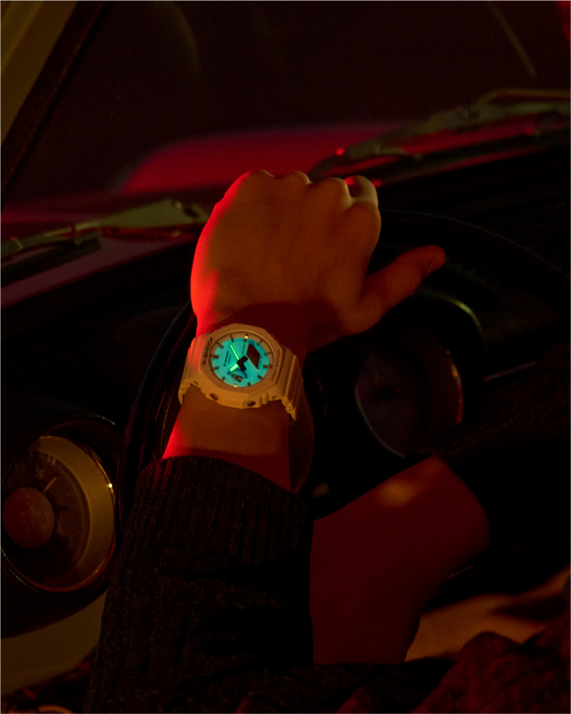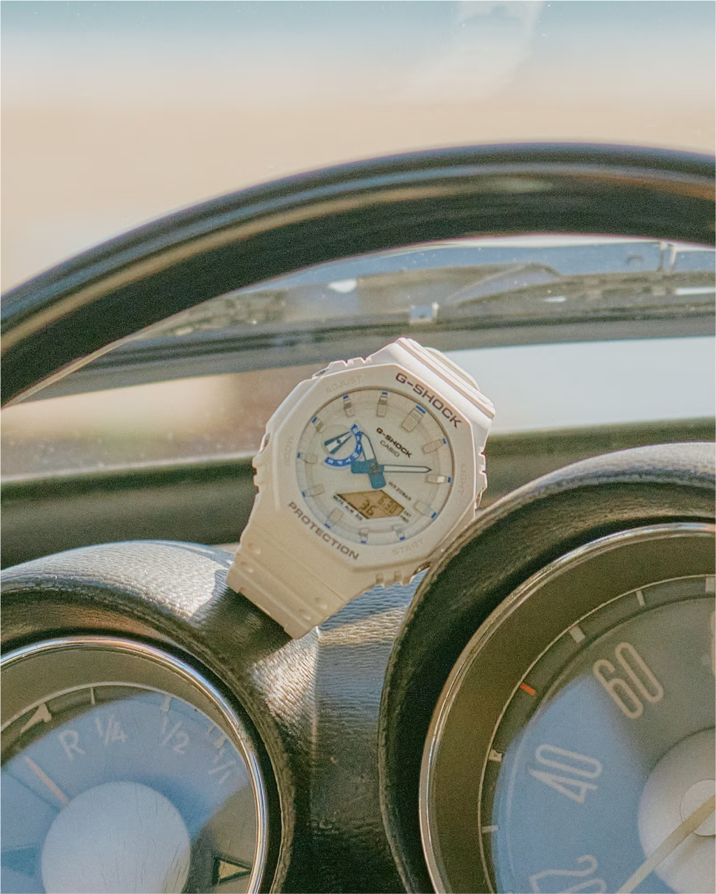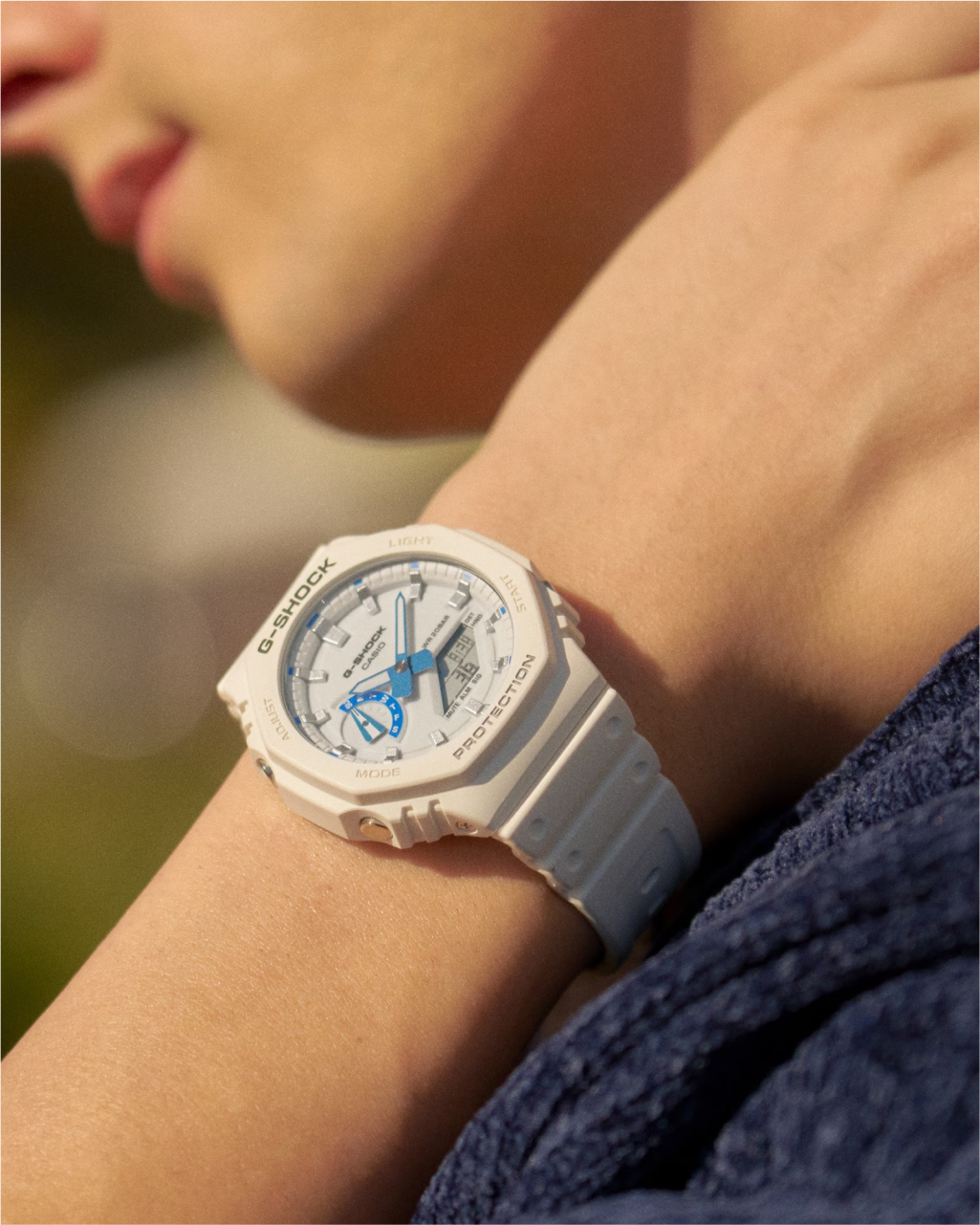 Take your inspiration from the summer seas, with the white and blue G-SHOCK. The watch’s blue phosphorescent face glows magically at night, evoking the shimmer of bioluminescent plankton floating in the sea. Paired with a white and blue color scheme, the design beautifully captures the beach’s dynamic transformation from the brilliance of the daylight sun to soft nighttime hues. Shimmery sea-inspired styles flow easily from casual settings to work situations.
