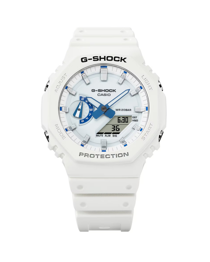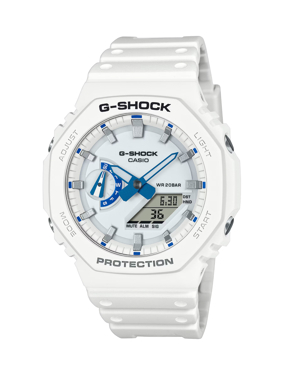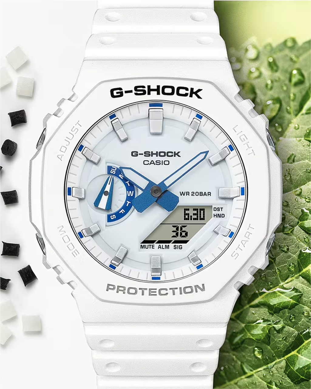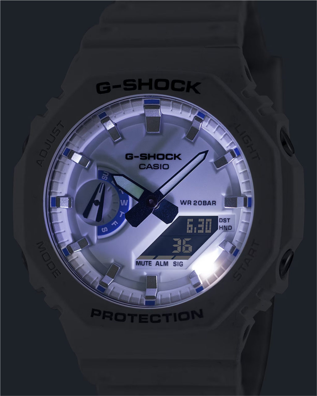 Take your inspiration from the summer seas, with the white and blue G-SHOCK. The watch’s blue phosphorescent face glows magically at night, evoking the shimmer of bioluminescent plankton floating in the sea. Paired with a white and blue color scheme, the design beautifully captures the beach’s dynamic transformation from the brilliance of the daylight sun to soft nighttime hues. Shimmery sea-inspired styles flow easily from casual settings to work situations.