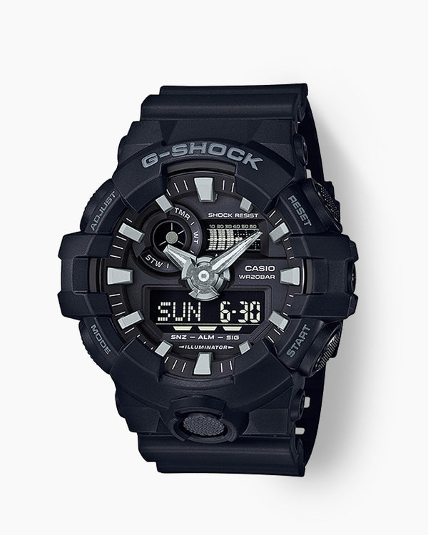 An analog-digital combination GA-700 model from G-SHOCK, which continues to pursue toughness and evolve. Improves readability using bold hands that are thick and powerful like carved metal, created using proprietary resin molding technology for the three-dimensional hour and minute hands. It also features a 3D face design achieved by making the dial ring and indices three dimensional to create synergy with the bold hands. Finished in colors that go well with classic street fashion items such as sweatshirts and hoodies. The colors are suitable for standard outfits and give you more options with casualwear.
