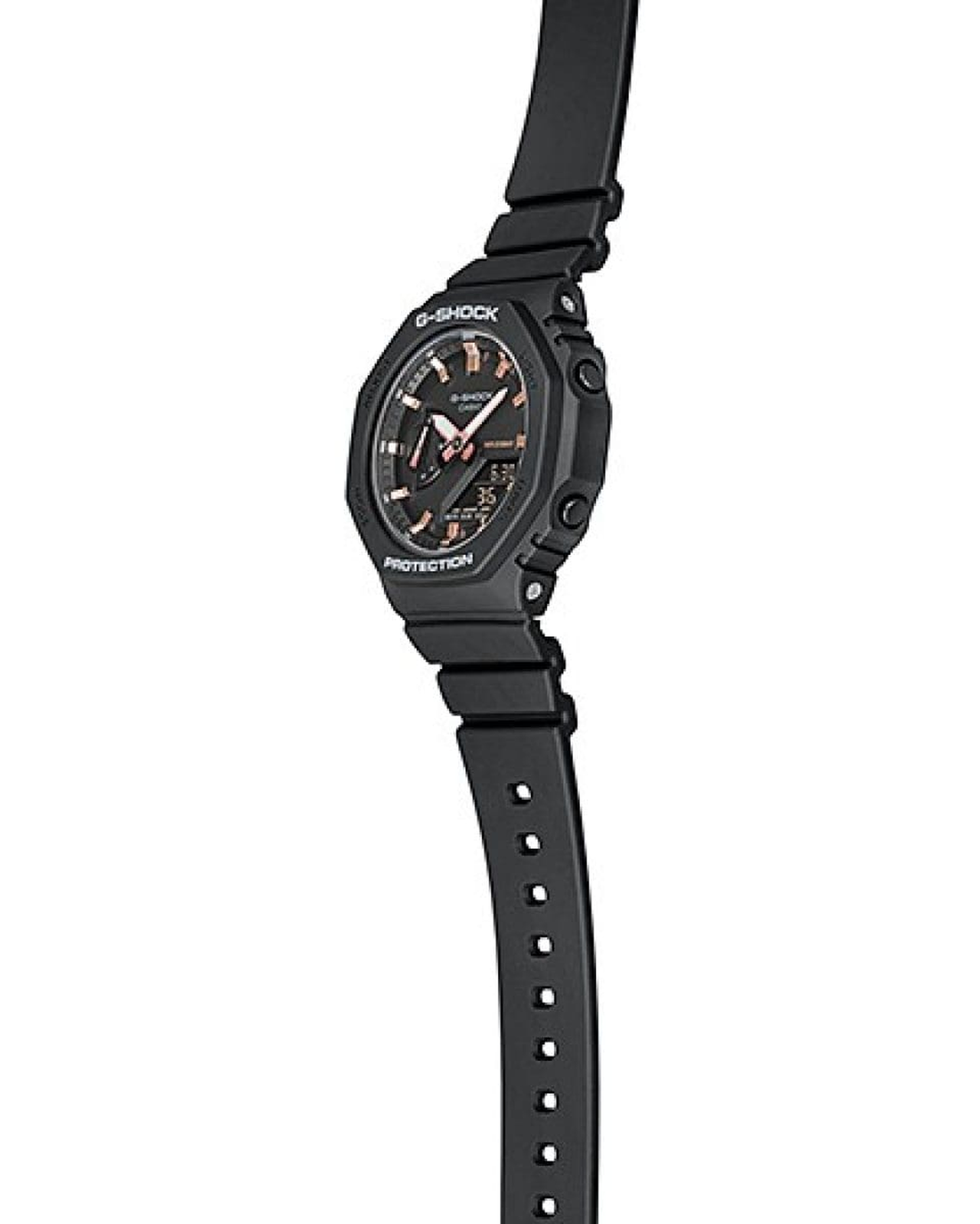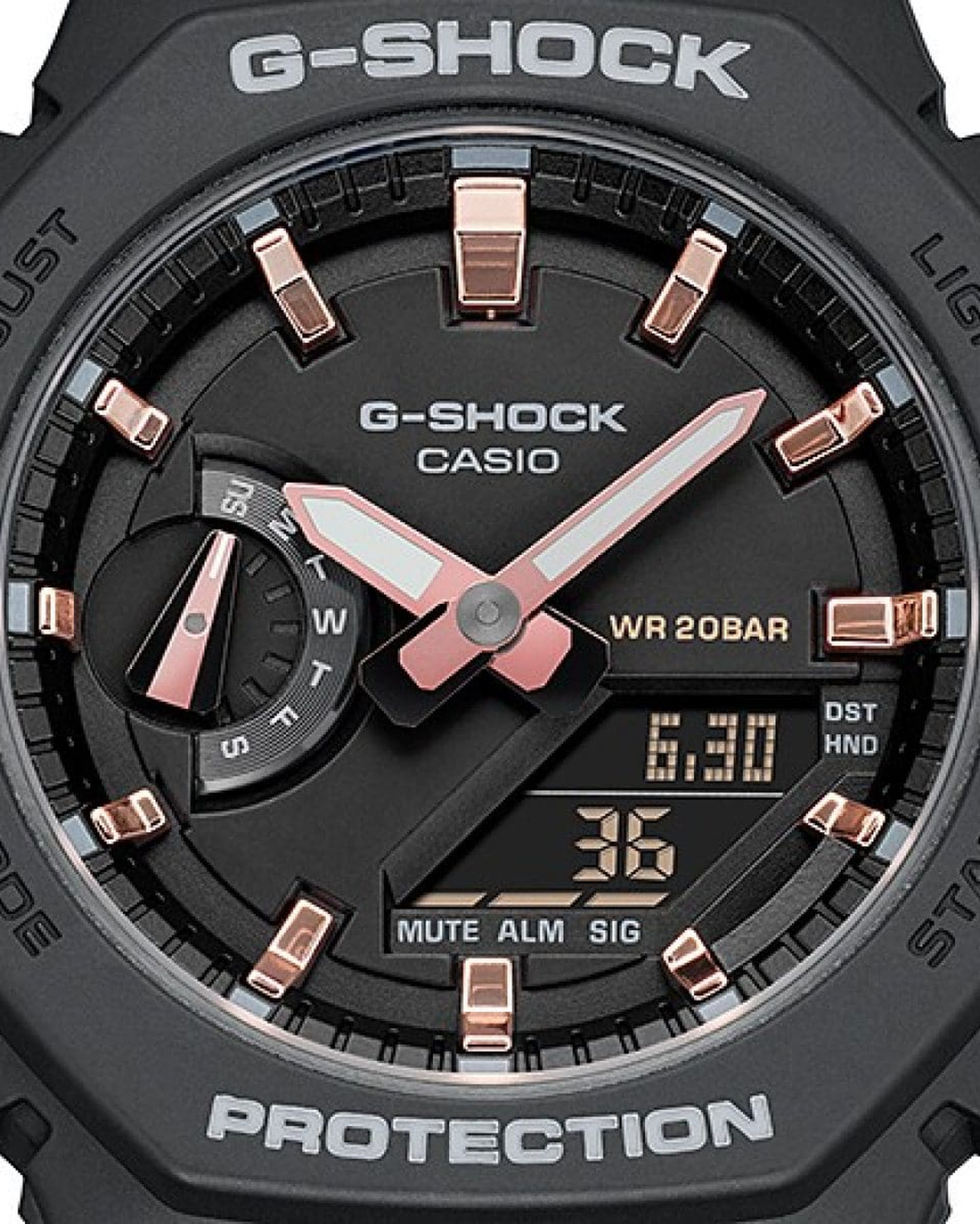 From G-SHOCK, the toughness watches that are ever evolving in an endless pursuit of strength, this downsized version of the popular GA2100 model has a simple, thin design that eliminates waste while maintaining a tough structure. The base GA2100 model is a thinner G-SHOCK model that inherits the octagonal shape of the first DW5000C model. The flat face and simple bar indices create a simple yet solid impression. The coloring is a matte black that goes with any fashion. The glittering metallic bar indices enhance the texture.