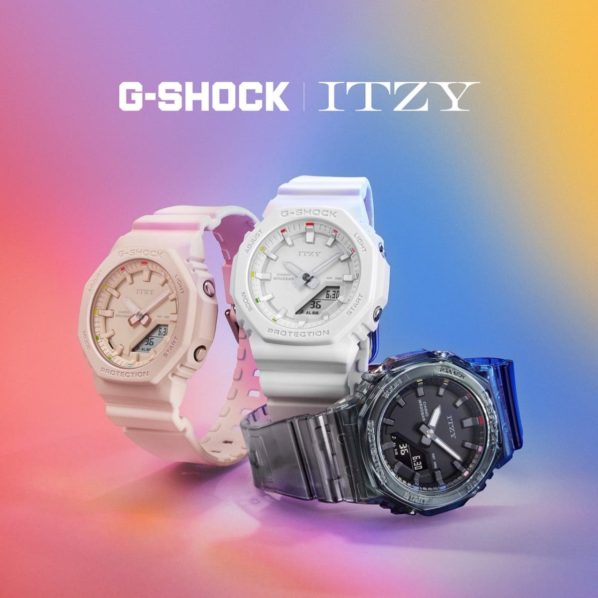The super special timepiece you’ve been waiting for! Introducing the collaboration with G-SHOCK brand ambassador ITZY — shining designs as cool and fashionable as your favorite girl group. The refined dial in monochromatic color scheme is accented with multiple different colors above the index marks, symbolizing the infinite possibilities that ITZY embodies. The watch design also draws inspiration from the group’s official light rings, the passion of MIDZY — the official name for ITZY fans. The group’s logo is featured on the dial at the 12 o’clock position and engraved on the case back.