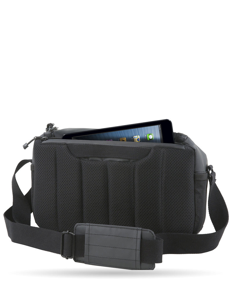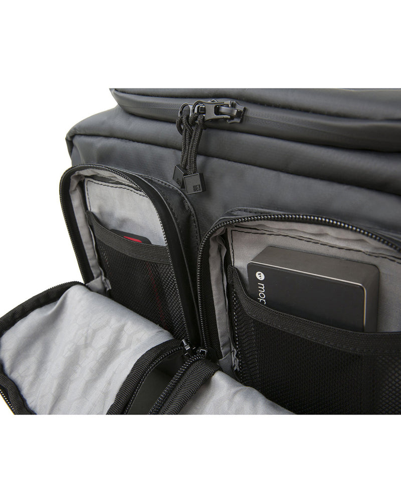The back of the bag features air-mesh for comfort. The back panel also has a weather resistant zipper pocket that is designed for your iPad/tablet. The exterior is constructed of from a heavy-duty, water resistant, matte black tarpaulin. The bag is fully padded in EVA foam. Also features quick access front pockets, and a mesh pocket on each side, handy for lens caps or accessories. Just like you would expect from HEX, this pack delivers maximum storage in a neat and flexible package, with good looks to boot!