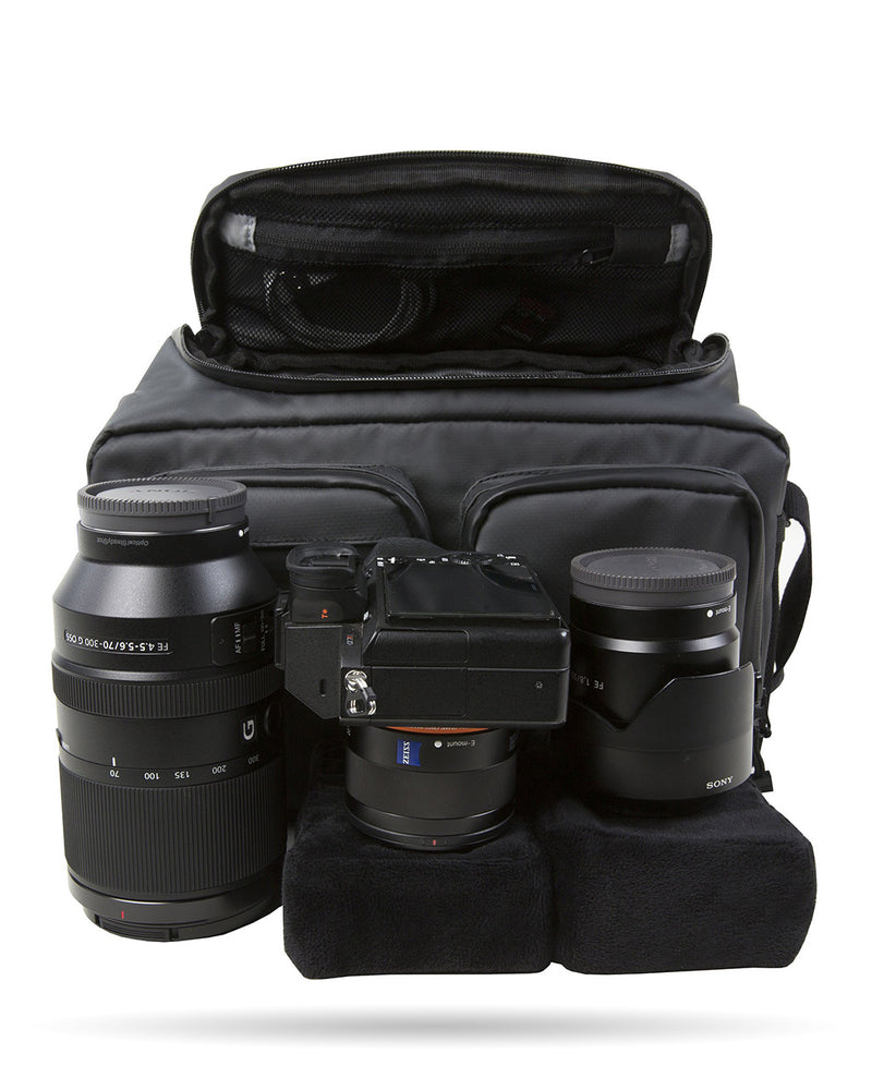 The Raven Mirrorless Bag is a premium bag with configurable storage area for your mirrorless or DSLR gear. Can be worn over your shoulder as a cross body bag or as a sling, but easily swings around the shoulder to your front to allow access to the main compartment without having to set the bag down. Easily holds a mirrorless camera and 2-3 additional lenses but can be configured for your needs via our 2 mini HEX Blox (TM) included with the bag.