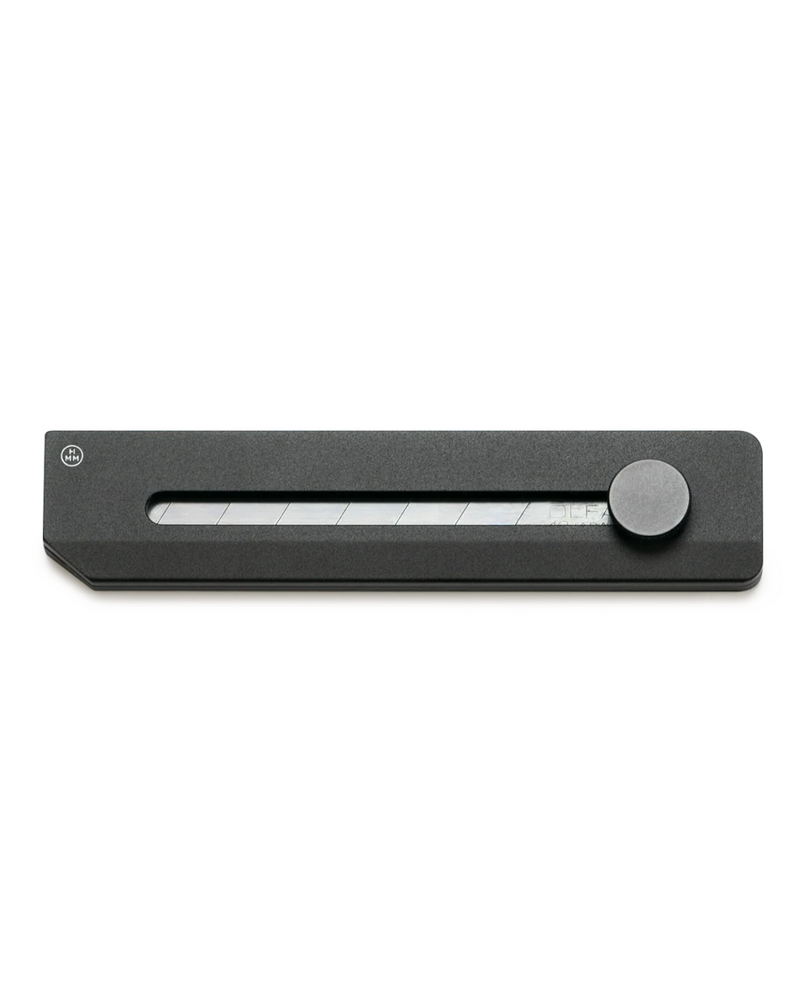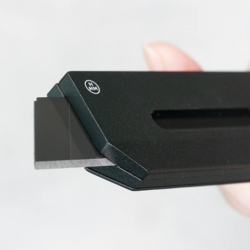 The HMM Utility Knife in black, army, and silver offers a stable, quiet, and sleek design that bridges the gap between large blades and delicate aesthetics. Featuring an OLFA large blade and aluminum body, this tool ensures stability, precision, and safety through its screw mechanism and enhanced control. Designed for artisans, such as product designers, leather crafters, and carpenters, the Utility Knife excels in handiwork. Its flip side includes a thin magnetic ruler with imperial and metric measurements for precise cutting.