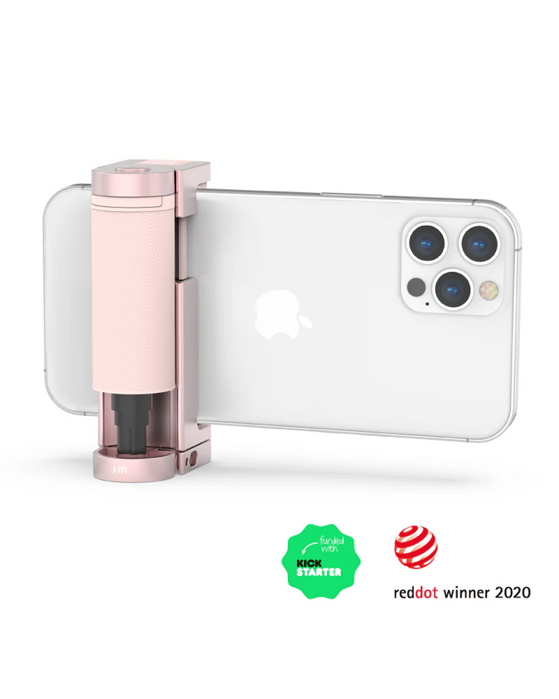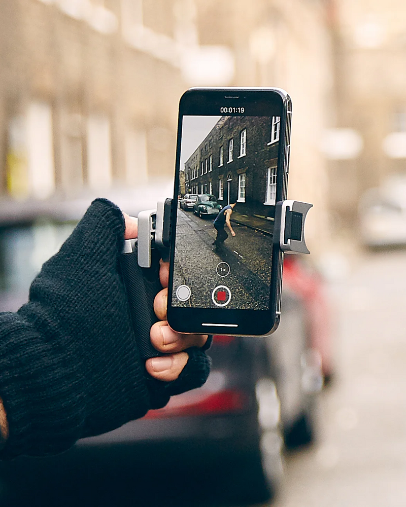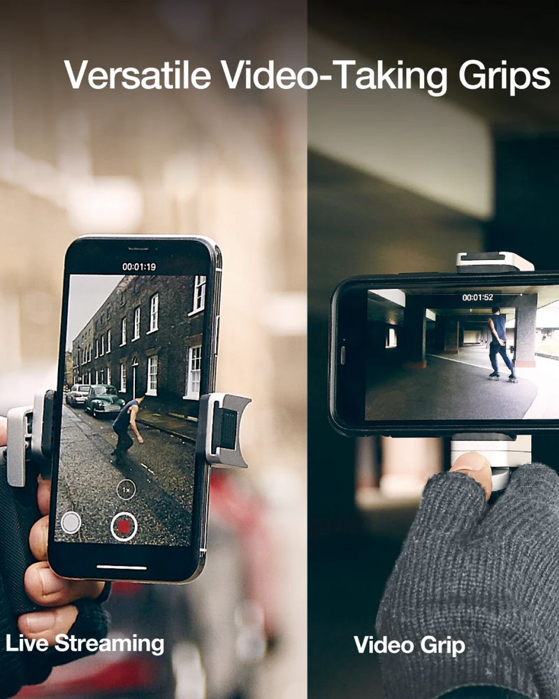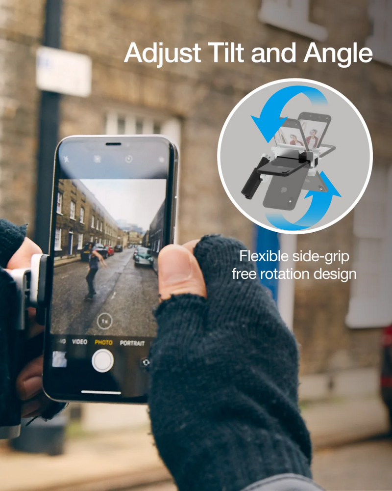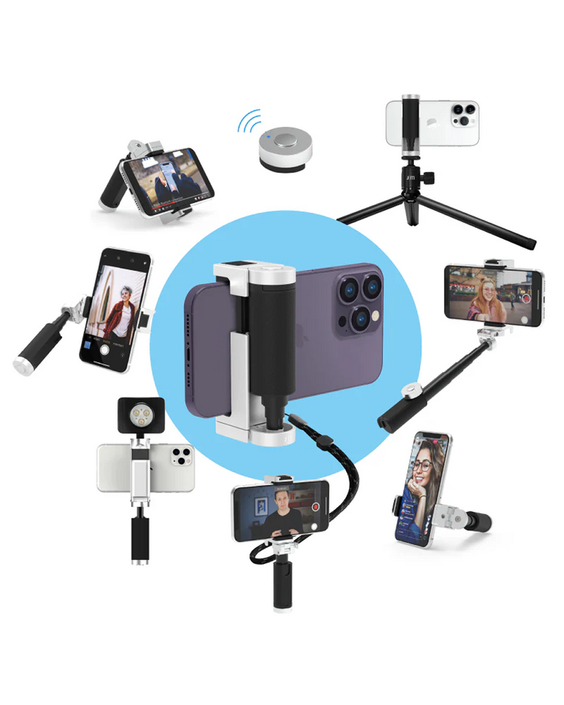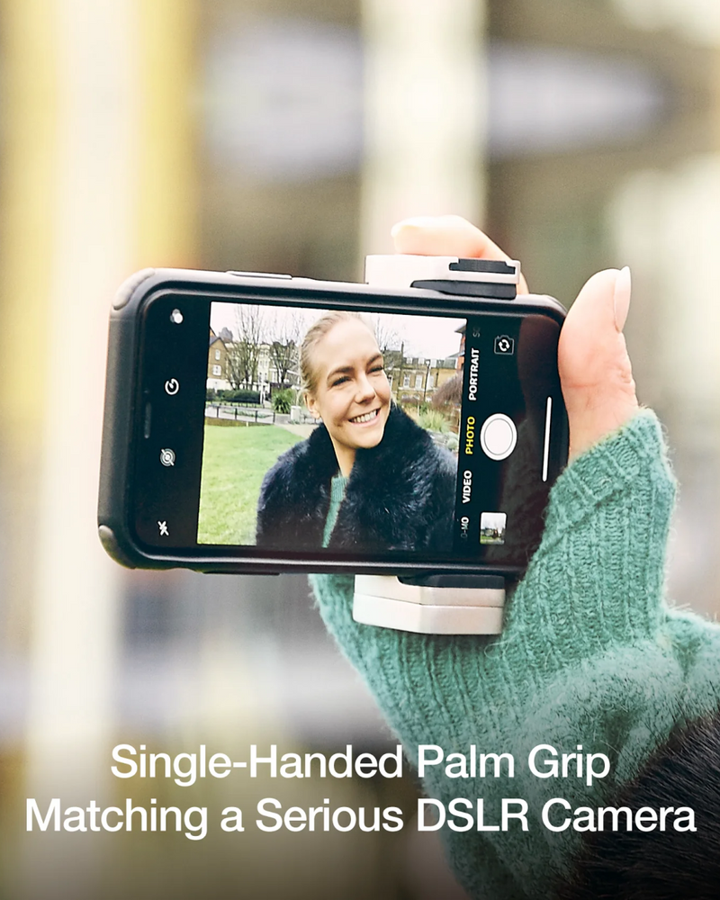The Bluetooth Pocket-Size Transforming Grip for mobile photography and content creation. ShutterGrip 2 instantly transforms your smartphone into a serious shooting tool. Its spring-loaded, tensioned grip attaches securely to almost any smartphone — with or without a case — providing a stable, non-slip handle and a built-in Bluetooth remote shutter. Designed for maximum versatility, ShutterGrip 2 functions as a camera grip, video grip, phone stand, and even includes a built-in selfie stick. It also features a cold shoe mount, standard tripod thread, and multi-directional rotation for shooting from creative angles in both portrait and landscape orientations. Compact and travel-friendly, it's the ultimate tool for street photography, vlogging, and everyday mobile shooting.