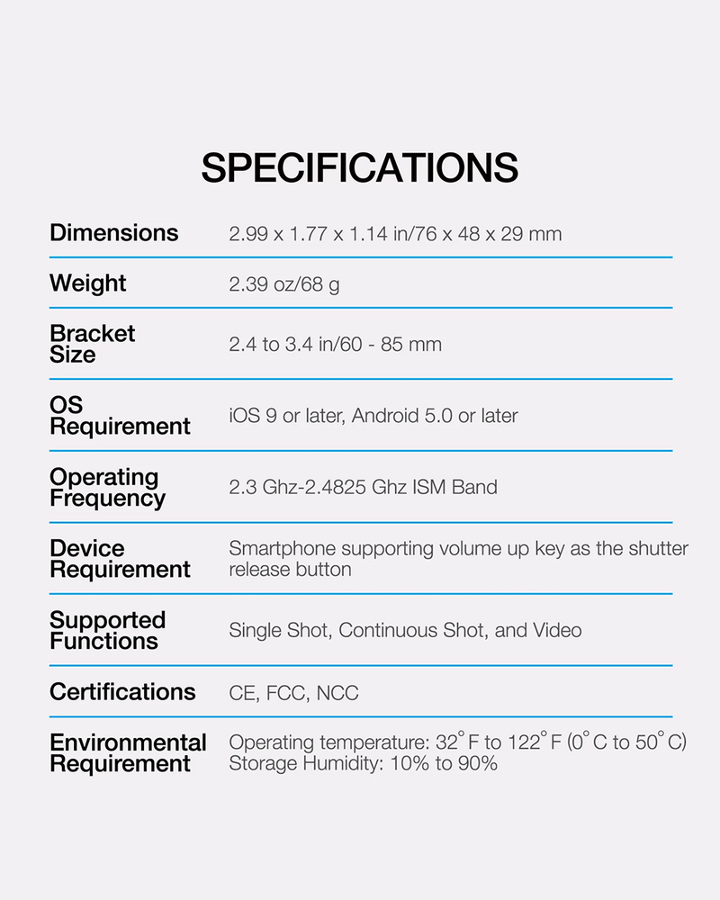 - Bluetooth shutter remote (detachable)