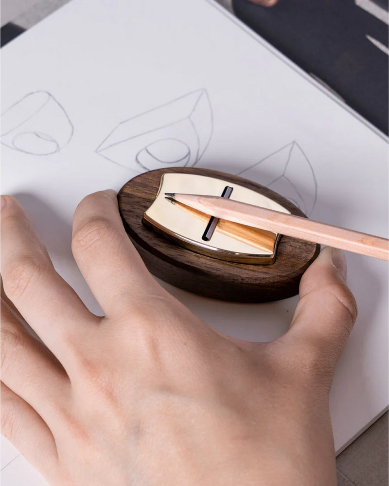 The base functions as a chamber for shavings as you sharpen and looks great on any desk. Both walnut and cork bases make the perfect companion to your Høvel.