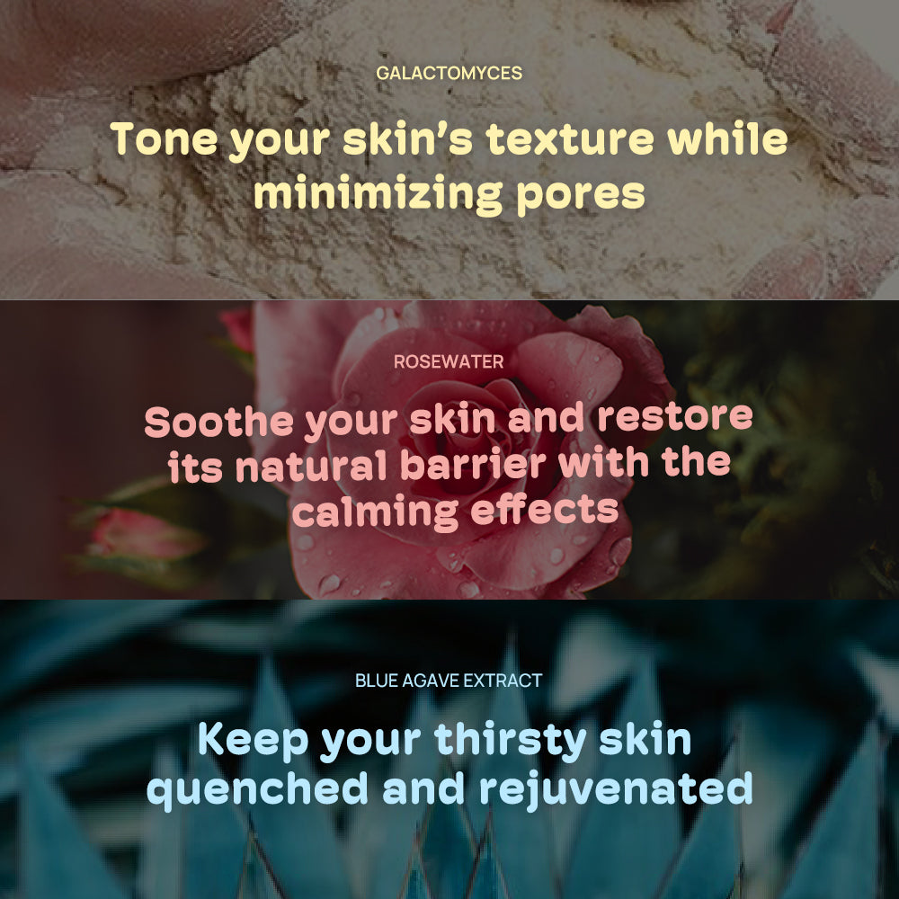 A double layer serum combined with avocado oil and a non-sticky water type serum formulated with Rosewater, Blue Agave Extract, and Galactomyces Ferment Filtrate. Great for: Skin texture toning, brightening, and nourishing!