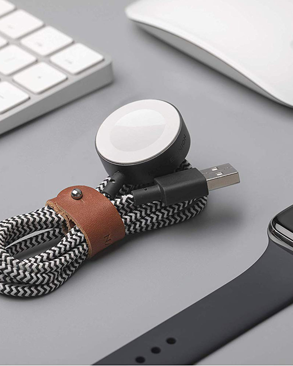 • Simply wrap up and secure your 4-foot Apple Watch charging cable with genuine leather strap.
